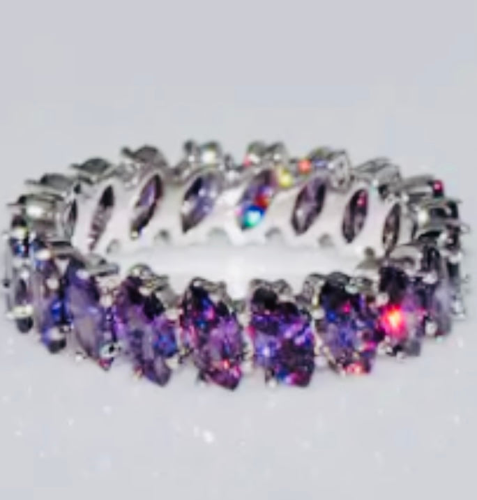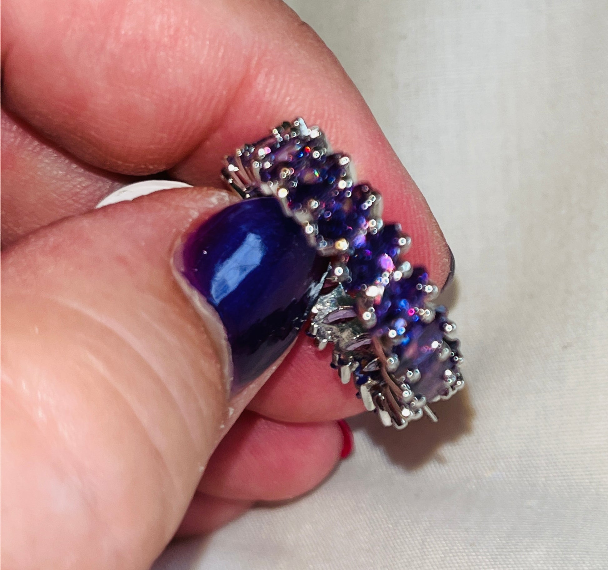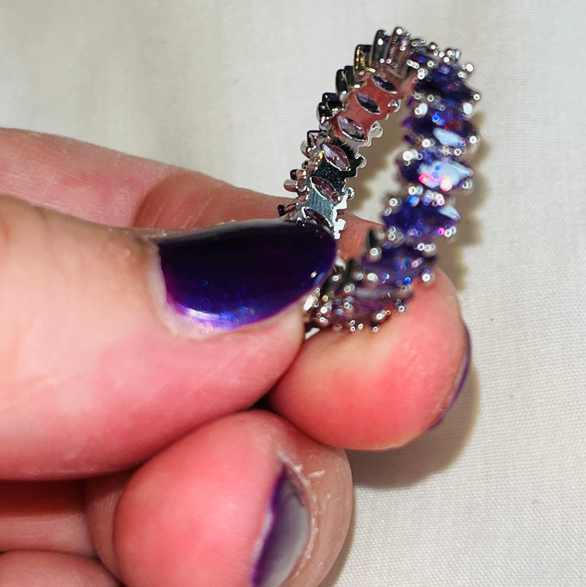 Silver-tone zinc alloy. Size 8. Stones are slightly lighter than they show in pics.