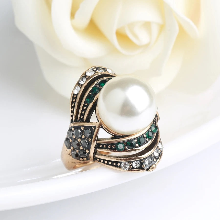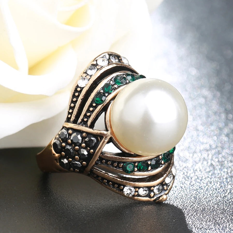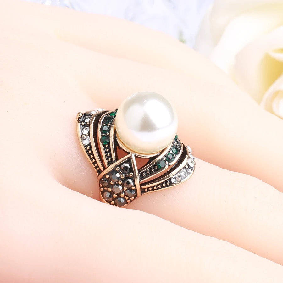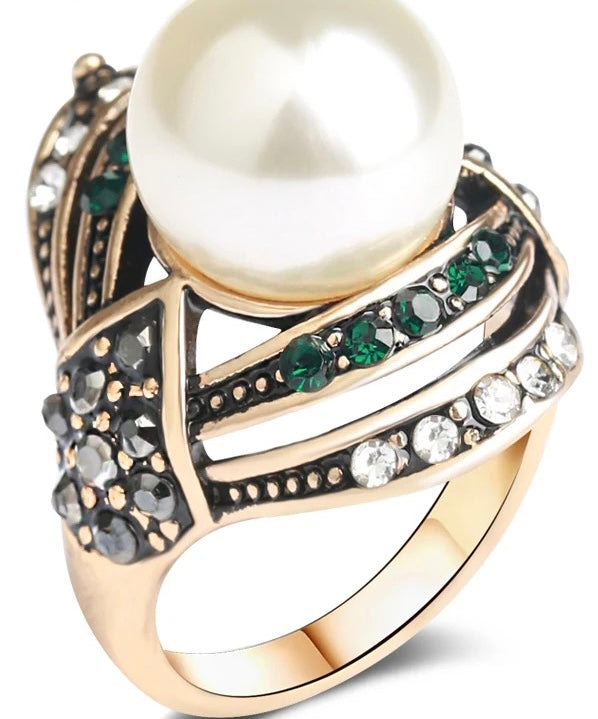 Simulated pearl. Bronze-tone ring. Size 6 1/2.