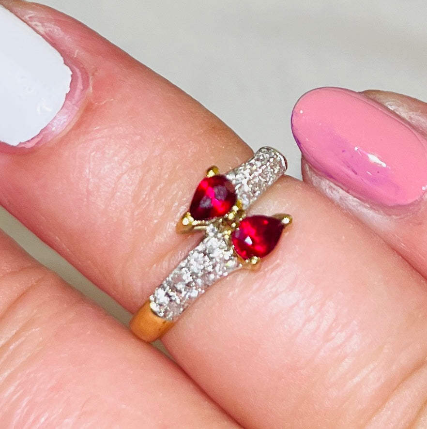 We purchased this ring from an estate sale. “800” stamp = 80% pure silver; 20% metal. Gold-tone. Ruby & diamond may be real? Honestly we don’t know. (We just needed more rings in a size 5.) Either way, this is a lovely ring to add to your collection.