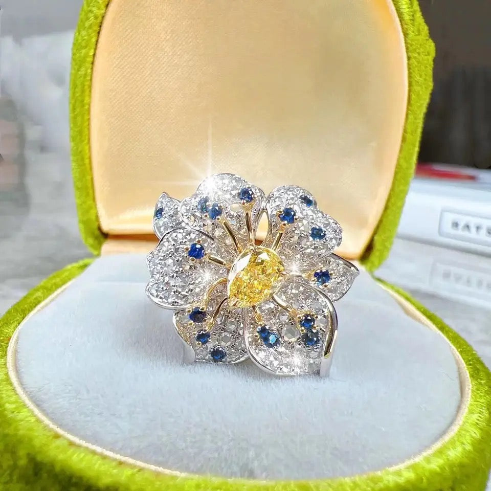 Luxury Yellow Blue White AAA Zircon Flower Ring
