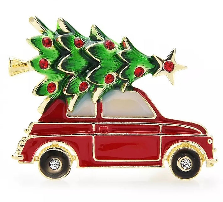 Red Car With Tree Christmas Brooch