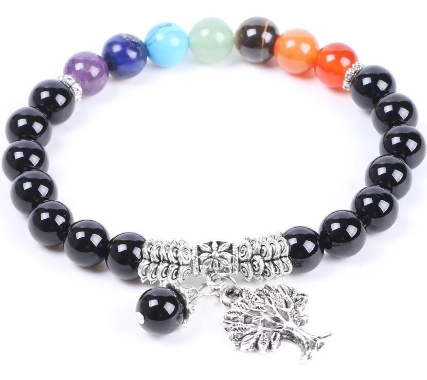 8 mm Black Onyx Natural Stone Beads with Titanium Pewter Plated Tree of Life Charm. 19 cm in length; inner length 17.1 cm. Elastic. Hidden safety clasp. Chakra Stones: Agate, Orange Jade, Tiger Eye, Aventurine, Blue Turquoise, Lazuli & Amethyst.