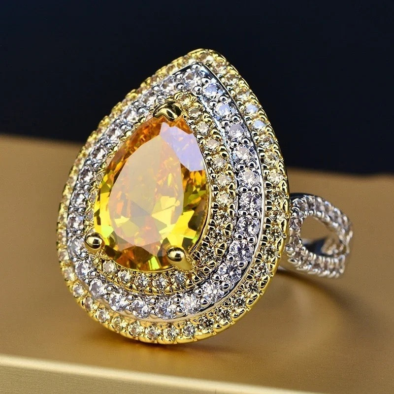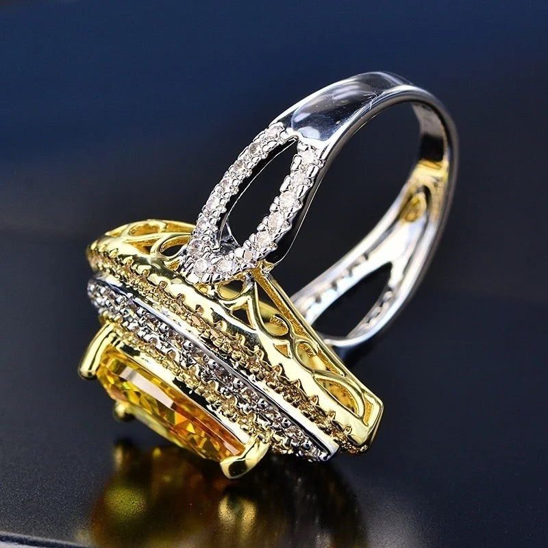 Size 12 1/2. Silver-tone zinc alloy. Citrine-yellow & white cubic zirconias.